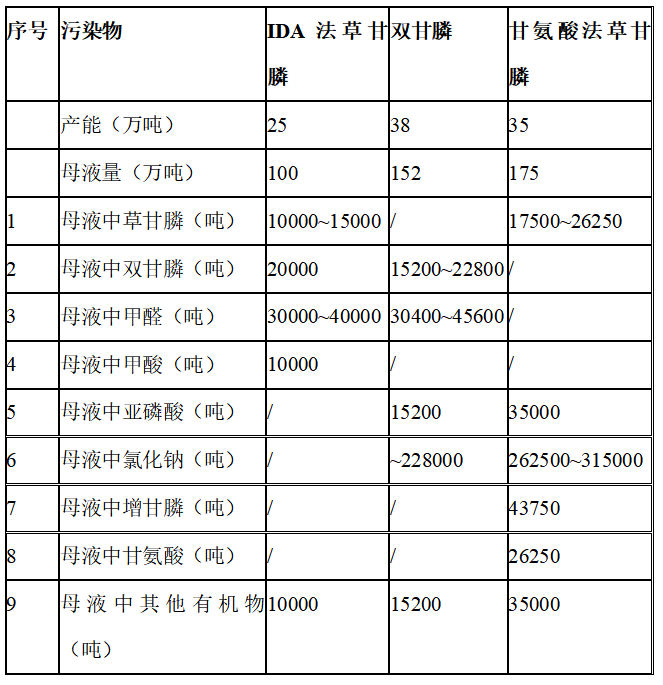 中國有近二千家農(nóng)藥企業(yè),產(chǎn)量居世界第二位,隨著農(nóng)藥行業(yè)的發(fā)展,其產(chǎn)生的難處理、高含鹽廢水越來越多,其特點(diǎn)是有毒有害物多,成分復(fù)雜、濃度高、難以生化,農(nóng)藥廢水是個一直困擾著企業(yè)發(fā)展的長期問題,是農(nóng)藥行業(yè)中環(huán)境治理頑疾。其中以草甘膦為典型代表,以草甘膦為例,據(jù)統(tǒng)計,我國草甘膦產(chǎn)能接近100萬噸/年,實際開工產(chǎn)能在60萬噸左右,其中IDA法約25萬噸,甘氨酸法約35萬噸。其中廢水組分復(fù)雜可生化性差。