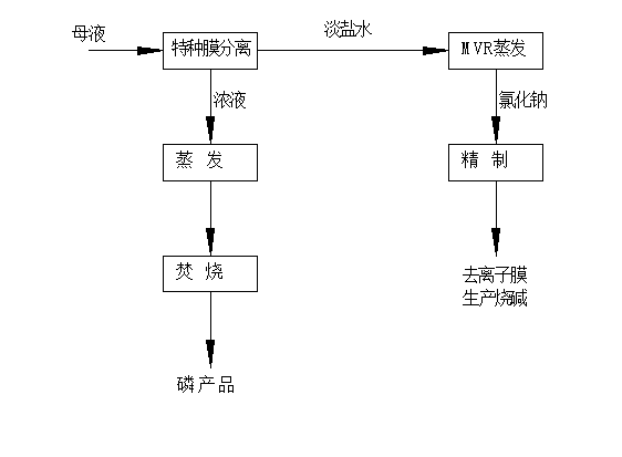 對于濕式氧化等高級氧化工藝,針對其一次的轉(zhuǎn)化率不高的問題,在通過濕式氧化,并降溫結(jié)晶獲得十二水合磷酸氫二鈉后,將鹽水通過膜濃縮工藝,將濃縮后的有機(jī)磷繼續(xù)回濕式氧化工序,循環(huán)套用提高其總的轉(zhuǎn)化率,其膜分離出的鹽水,經(jīng)MVR蒸發(fā)結(jié)晶后,精制制備離子膜鹽水用鹽。